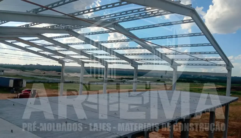 Pré-moldado medindo 20 metros de frente por 25,25 metros de comprimento e 7,80 metros de altura. Mezanino com 20 metros de frente por 5 metros de fundos e 5 metros de altura. Além disso foi fabricado com ambas as laterais beiral, possui vigas de travamento devido a altura do pé direito.