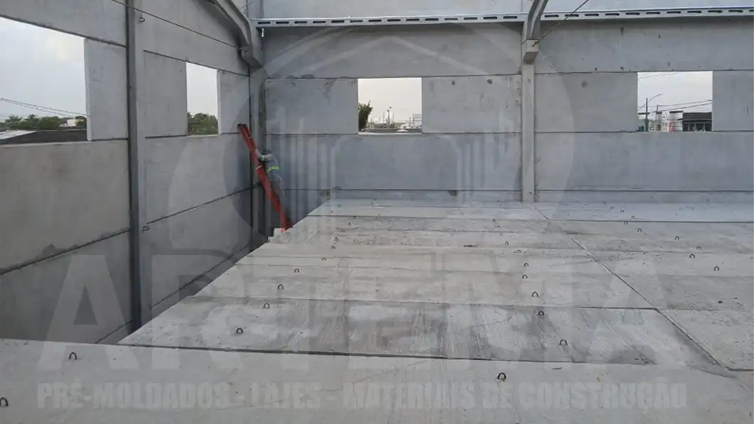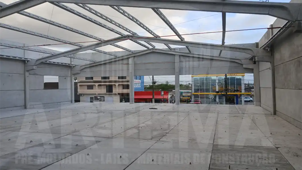 Pré-moldado medindo 14 metros de frente por 19 metros de fundos e 8,87 metros de altura, com mezanino e fechamento conforme projeto.