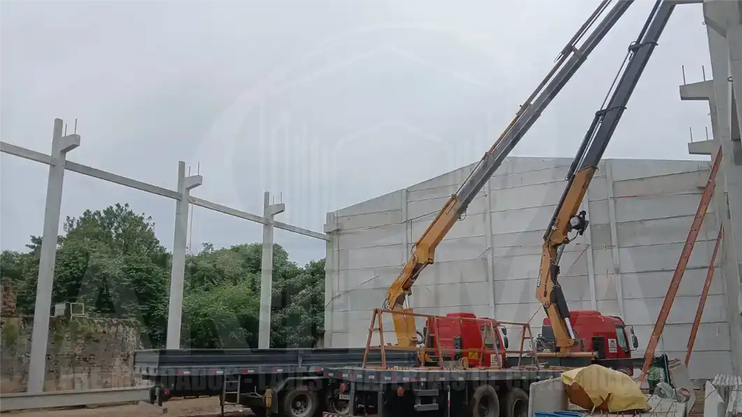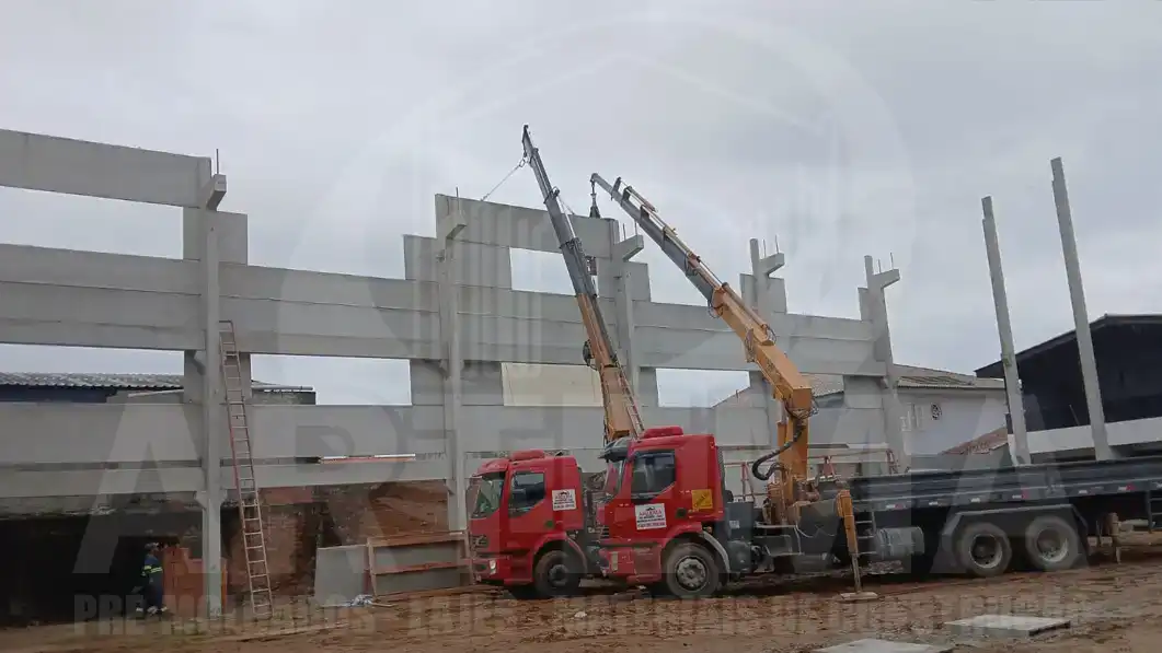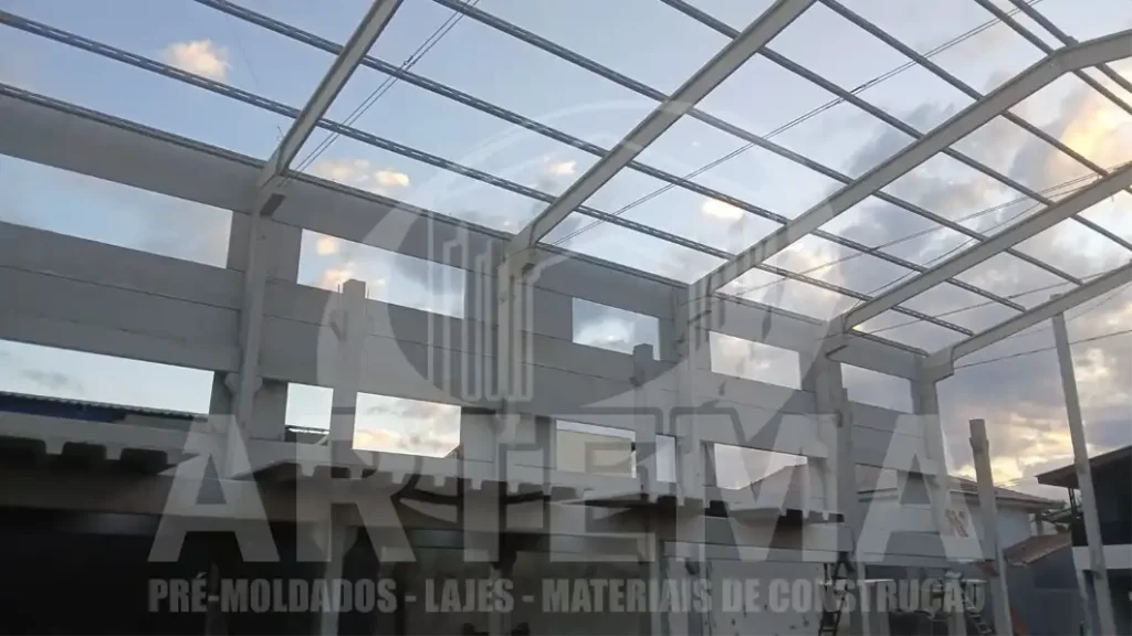 Pré-moldado medindo 22 metros de frente com 30 metros de comprimento e 10 metros de altura, com mezanino medindo 6,20 metros de frente, 30 metros de comprimentos e dois andares de 3 metros de altura. fechamento com placas cimentícias.