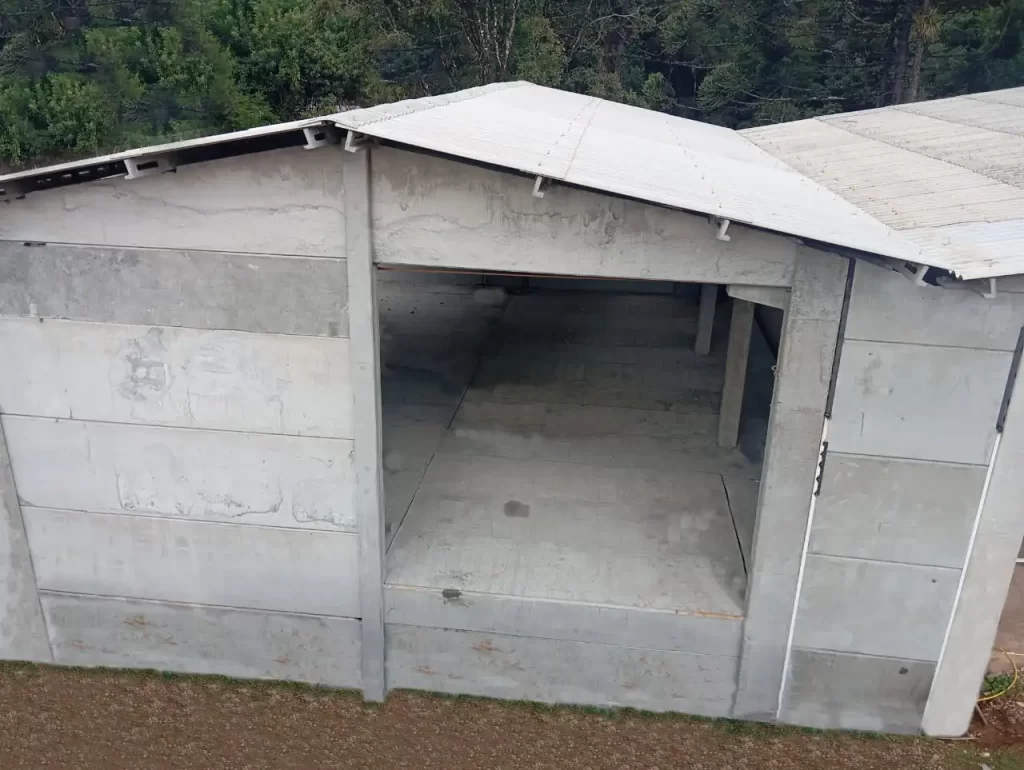 Pré-Moldado medindo 10 metros de frente por 15,25 metros de fundos com 8,19 metros de altura, mezanino 11,80 metros de frente por 15,25 metros de fundos com 3,10 metros de altura, beiral para os quatro lados. Fechamento em placas.