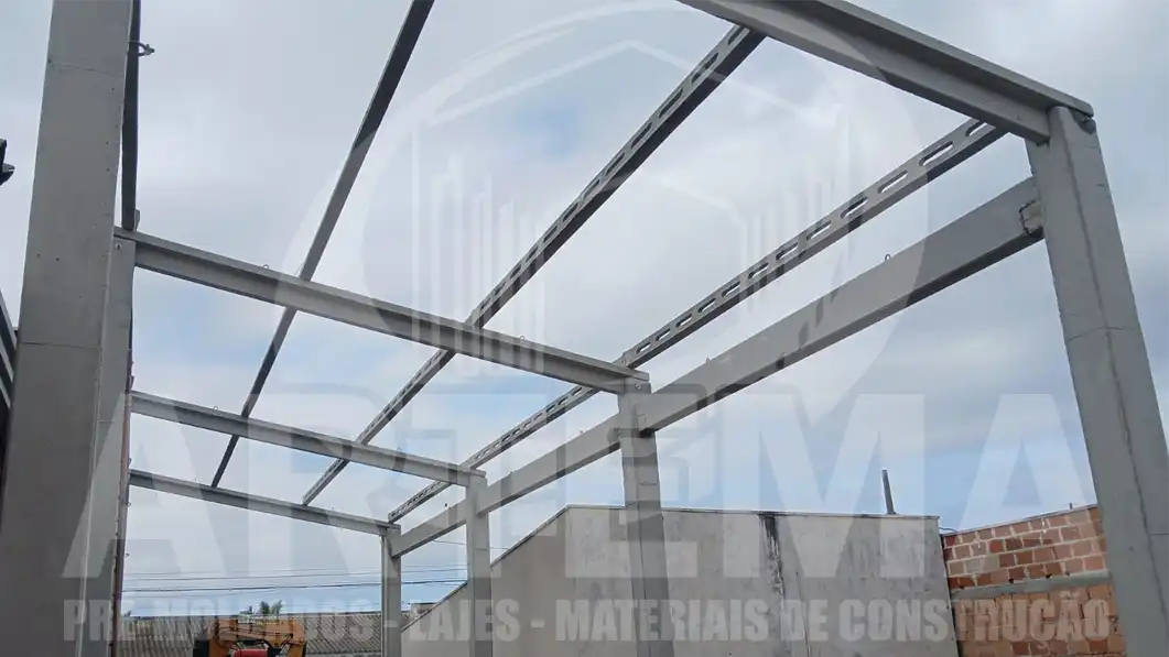 Pré-moldado medindo 5 metros de largura, 15 metros de comprimento e 4 metros de altura. Modelo meia água.